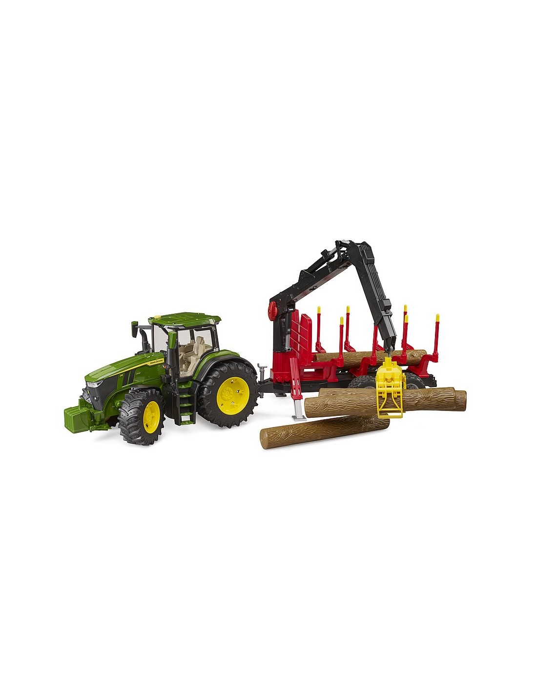 Già dotato di quattro tronchi, questa combinazione include il funzionale rimorchio forestale. Il modello è dotato di una pinza caricatore girevole e oscillante, che permette non solo di trasportare i tronchi, ma anche di caricarli e scaricarli. Con i montanti regolabili, il moderno rimorchio forestale invita subito a giocare. Anche altri rimorchi dell'assortimento agricolo BRUDER possono essere montati su questo trattore.