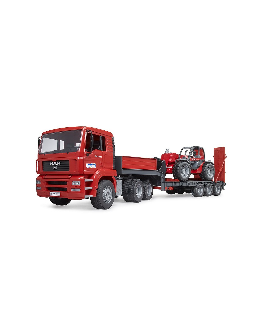 Per i trasporti pesanti, come ad esempio il trasporto di grandi macchinari edili da un cantiere all'altro, vengono spesso utilizzati rimorchi a pianale ribassato. Nel mondo BRUDER, il semirimorchio a pianale ribassato MAN TGA trasporta un Manitou MT633 fino al prossimo luogo d'impiego. Questo imponente veicolo dispone delle note caratteristiche del semirimorchio a pianale ribassato MAN, come il giunto a ralla del semirimorchio completamente funzionante, i supporti ribaltabili e le rampe di accesso mobili. Il caricatore telescopico articolato in dotazione è dotato di un braccio telescopico retrattile e regolabile in altezza e di una benna rimovibile.
