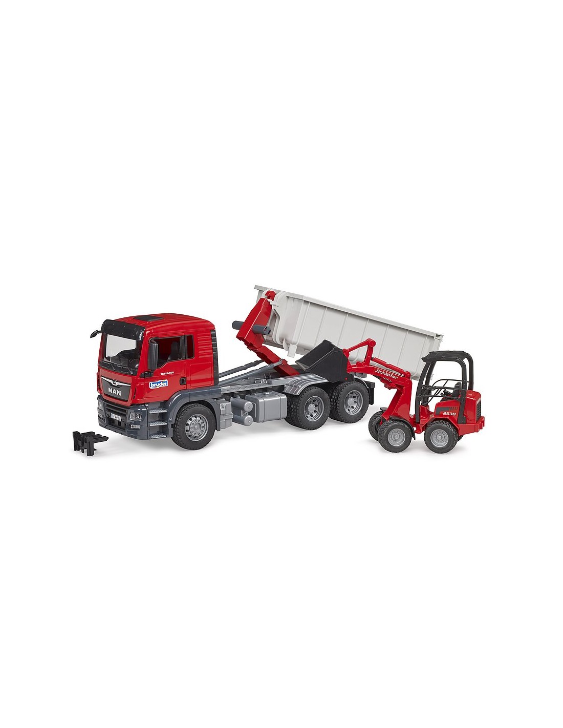 il MAN TGS è un allrounder perfetto per l'uso in cantieri, per il traffico interurbano e per la distribuzione locale. Di costruzione robusta, si caratterizza per la potenza dei motori e per il carico utile superiore alla media, il tutto per rendere questo camion il prototipo del „tuttofare“ con tantissime innovazioni a bordo. La cabina del conducente in 2 colori è arricchita da portiere apribili e mette a disposizione un ambiente di lavoro moderno per ogni personaggio bworld. Il container scarrabile dispone di due sponde sollevabili sul retro e può essere spostato all'indietro e riportato in posizione grazie al braccio prensile. Quando il container è posizionato al suolo e le porte sono aperte, è addirittura possibile fare accedere al container i veicoli BRUDER più piccoli e trasportarli con il camion. Questa possibilità viene sfruttata molto spesso anche nei cantieri reali e ora anche i piccoli capocantieri possono farlo nella loro cameretta.