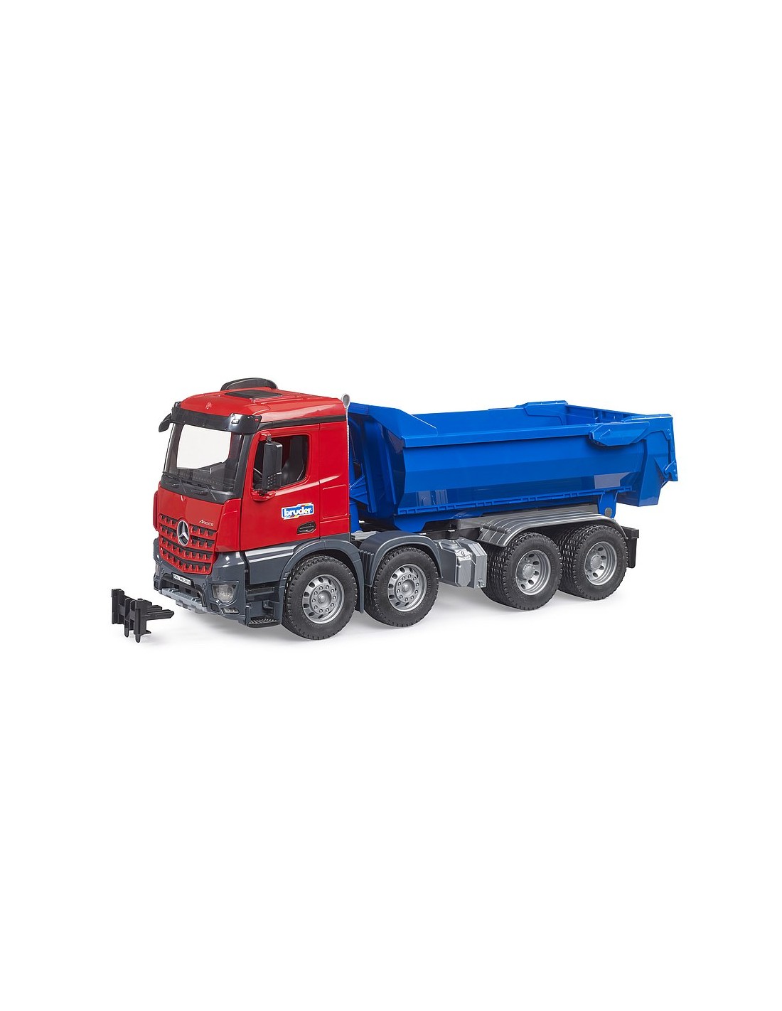 Forza, robustezza ed efficienza sono spesso decisive in una giornata di lavoro su strade e cantieri. È proprio per rispondere a queste esigenze che è stato creato il nuovo Mercedes-Benz Arocs. Oltre a queste caratteristiche tecniche, anche il design è stato revisionato in maniera conforme. Ad esempio, il frontale della mascherina del radiatore è realizzato nel tipico look Arocs e ne esprime l'enorme forza. Anche in questo modello è stata valorizzata la consueta robustezza BRUDER e la cabina è stata dotata di portiere apribili, in modo che i personaggi BRUDER possano entrare all'interno. Grazie alla speciale forma a halfpipe, il carico viene posizionato automaticamente al centro, il che è utile sia per la guida che per lo scarico più semplice possibile. Il cilindro estraibile in tre parti della conca e il portellone posteriore possono essere innestati in diversi livelli per consentire il maggior numero possibile di situazioni di gioco.