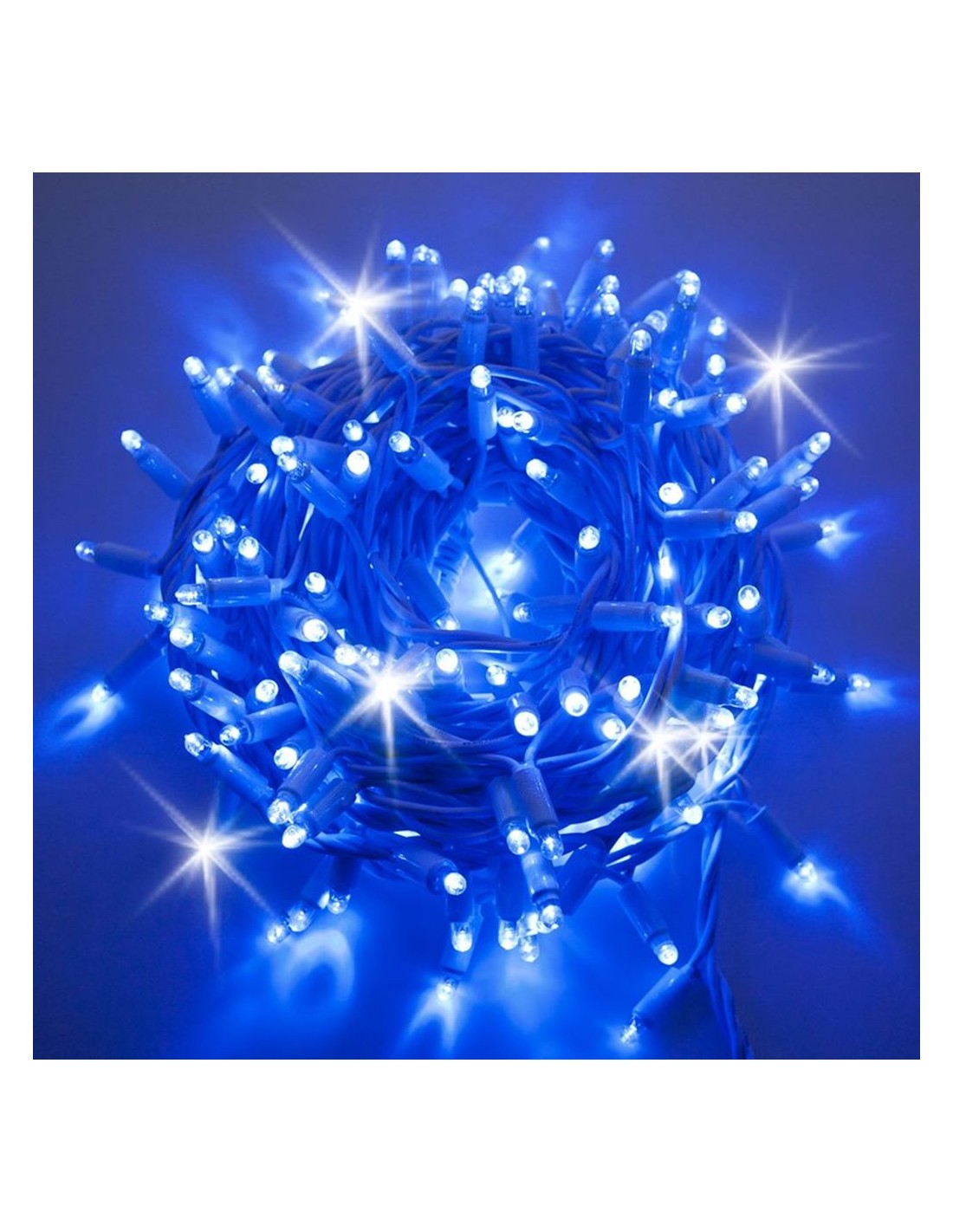 Catena di microluci prolungabile per uso interno ed esterno con led blu e giochi di luce scintillanti. Questa stringa ha 200 led ultraluminosi (da 7 mm di diametro) su 10 m di lunghezza totale della catena. Grazie ad un interspazio particolarmente corto tra le lampade (5 cm) la catena risulta particolarmente indicata nella realizzazione di motivi luminosi o laddove sia necessario decorare con un'alta densità di lampade.