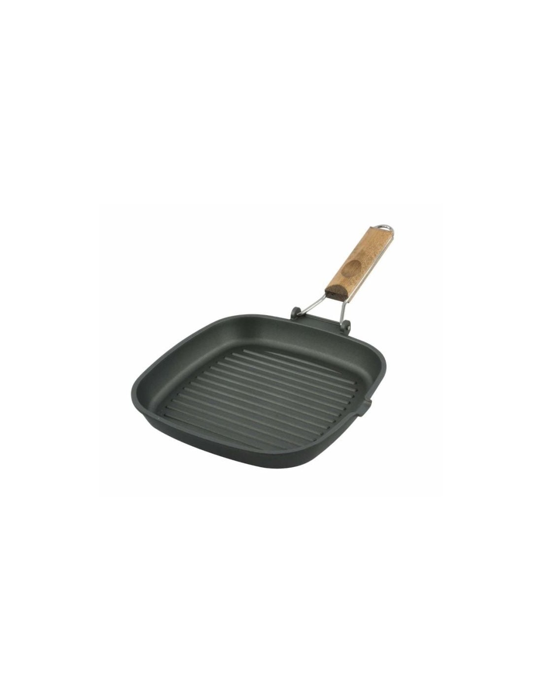 Bistecchiera quadrata in alluminio pressofuso con triplo rivestimento antiaderente Pfluon cm 26x26 della linea Dietetica. La bistecchiera ha un elegante effetto pietra ed è provvista di un apposito manico in bachelite antiscottatura.