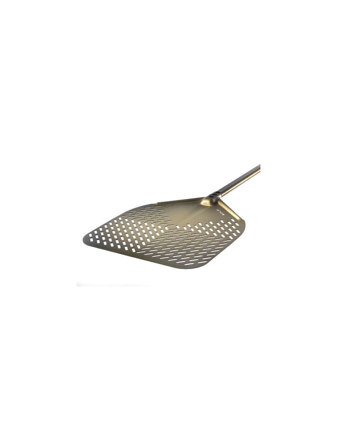 Pala per pizza in alluminio speciale G.H.A. Golden Hard Anodizing è il nome di questo particolare trattamento di origine giapponese, un’ossidazione anodica con successiva sigillatura delle microporosità con ioni d’argento, che conferisce alla lega d’alluminio caratteristiche e prestazioni tipiche dell’acciaio inox. La nuova foratura garantisce lo scarico della farina in doppia direzione garantendo un risultato impareggiabile.