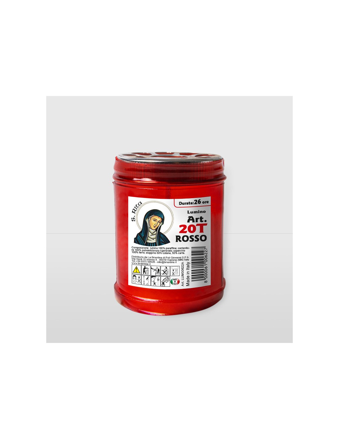 Lumino Santa Rita 20L, paraffina a pasta bianca e stoppino in cotone cerato. Porta lume rosso dotato di parapioggia dorato.