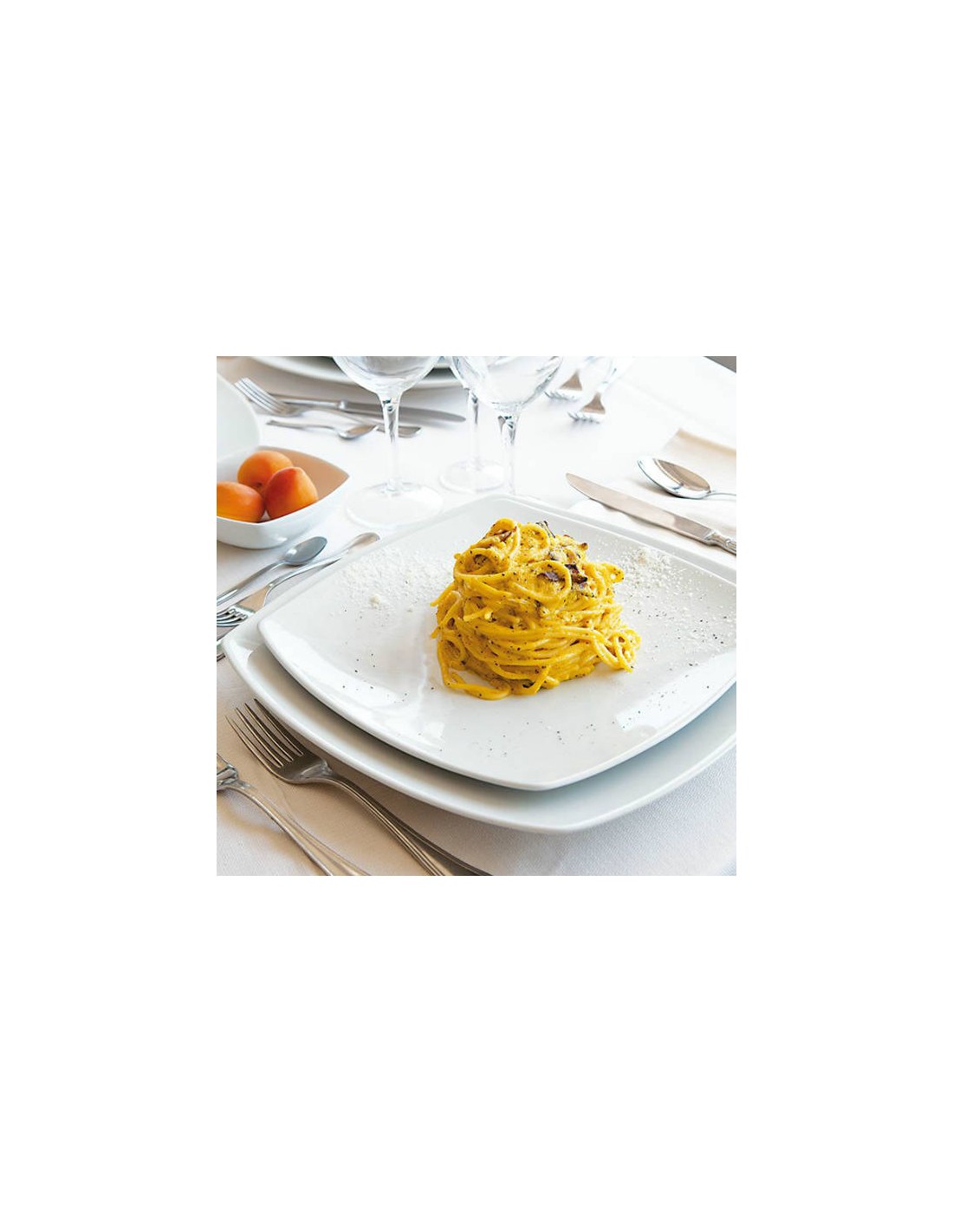Fa parte di una collezione di piatti dalla forma quadrata con angolo smussato e lato leggermente bombato.